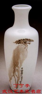 仿清康熙莱菔瓶造型。颈稍细长,丰后,肩以下渐内收,圈足。通体施高白釉,釉汁沽白无瑕,似冰如玉。器腹以精湛的釉上粉彩装饰忮艺和深厚的国画写意山水之功力,勾给出一幅质朴清新、雅洁明快的画面。虽只画一松一石,却具有永恒高洁的象征寓意。着色用墨不多,富有浓谈变化,笔法苍劲。画中书法印记和松石融为一体,富有民族文化意蕴。