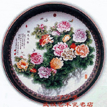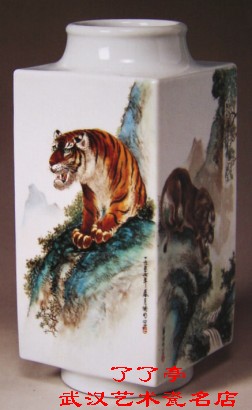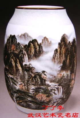 气势恢宏的出水画面格调一致,浑然一体,似有一股浩荡之气迎面扑来。作品特别突出的是云的处理,白云在群山之间穿行,天边流云飞渡。这是作者激情的物化,更增强了山的气势。山外是山,山下流水,水、云相连,形成有运动感的曲折线。构圈上强调了近景、中景、远景的空间表现。作者凭借深厚的国画功力和全面的艺术修养,成功地运用粉彩材料,表现出中国水墨画的韵味,展开了气象万千的山水画卷,抒写了热爱祖国大好河川的激越情怀。