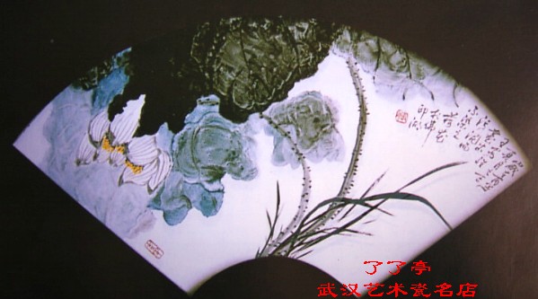 荷花具有出淤泥而不染的高洁品格。画粉彩时可以运用画国画一样的笔调,大笔淋漓泼墨画荷叶,产生大面积的粉彩的效果。小笔笔勾叶脉绌茎、形成放与收的对比。花头的画法正好反过来,用顿笔起伏关系比较人的线条勾成。白花的感觉是虚,与实的荷叶又是一组对比。构图上产生倾斜,形成动感。