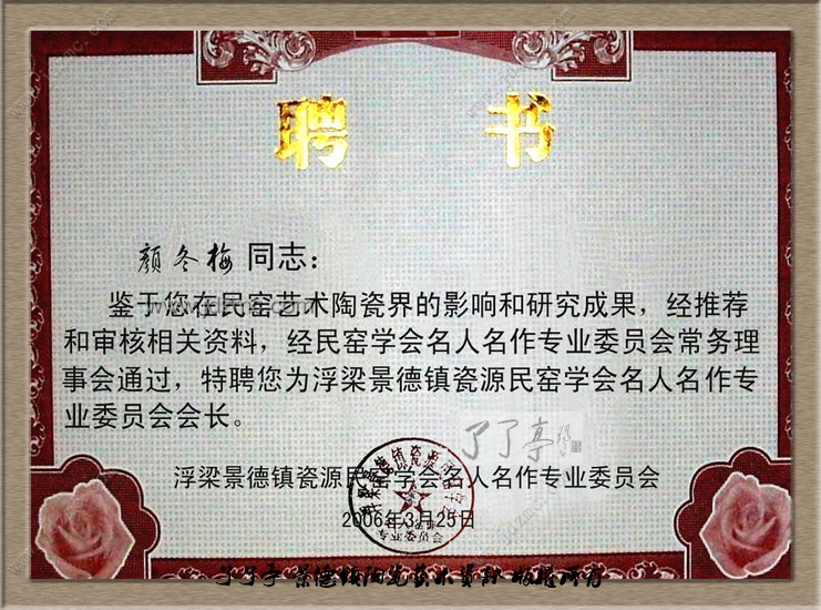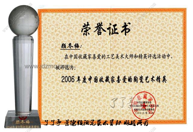 颜冬梅,女,1961年出生于景德镇,一九七五年随父在景德镇市美术瓷厂学习陶瓷绘画艺术,一九八0年考入景德镇市古窑瓷厂,跟随大师杜浩生学习陶瓷绘画艺术。现为浮梁景德镇瓷源民窑学会常务理事,高级研究员,民窑学会名人名作专业委员会会长,景德镇市高级工艺美术师,景德镇市美术家协会会员,景德镇市高岭学会会员。