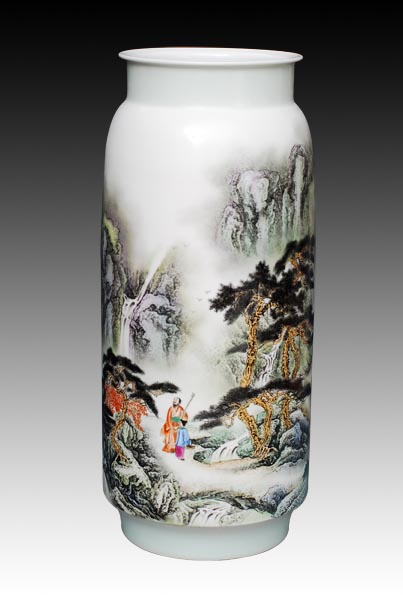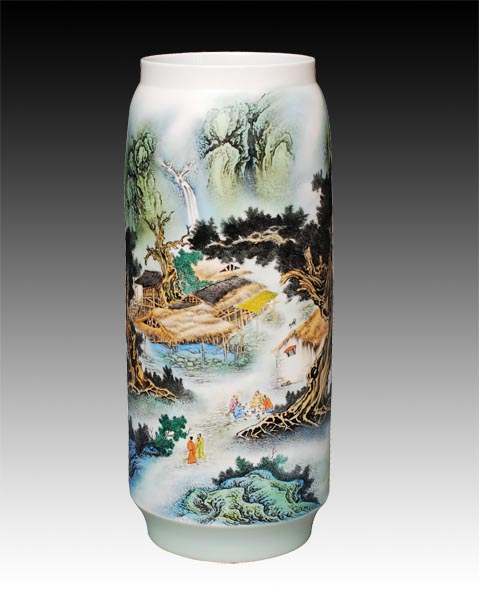 刘亮 号逸飞, 1976 年生于安徽,工艺美术师,美术家协会会员。从小受民俗文化的熏陶,对传统文化产生浓厚的兴趣, 1998 年开始涉足陶瓷艺术领域,从小专功于山水画,历经十几个春秋,如今自成一体,自创磨沙彩釉山水独具特色,所作山水集各家之长,在师法古人的基础上重写生、气之妙、洗以趣为先。代表作品有《草庐雅居》在华东六省市工艺品大赛获二等奖,作品深受广大收藏家的青睐。