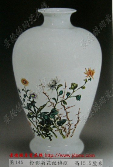 民国时期艺术水平在中等,或中等偏上的花卉纹饰器物较多,虽绘画不甚工细,但勾描有序。虽艺术水平不高,但物美价廉,具有广泛的市场,为一般市民阶层所欢迎。 图137粉彩花卉图四系盖盒,盖面一侧绘有牡丹纹饰,另侧墨书“富贵长春”隶书。盒壁一侧以细线勾描牡丹轮廓,内填红、紫等色。花蕊色黄,中有浓密的墨点。花瓣尖端色彩较浅,近根部则较浓。花苞以赭色平涂,花蒂上点以墨彩。从整体来看,技法不甚高明,线条较硬,色彩变化不多,尤其是花平淡无奇,但仍较好于晚清叶片夸张细碎的图案化牡丹。外壁另侧墨书“大富贵,亦寿考,多福禄,宜子孙,辛亥仲冬奇赏轩作于南昌”。在目前所见有年代可考的民国器物中,此器的时间最早。因辛亥革命在1911年10月10日,而民国元年为公历1912年。仲冬为农历十一月的别称,按公历则在1912年。而其它有“辛亥”字样的器物不能排除为清末之作。 图138为粉彩秋菊图瓷板,画面正中为两株秋菊,一高一矮,高者菊花饱满并蒂,矮者花朵平实。菊花双勾填色,勾线流畅劲健,填色准确,但色泽不艳。菊叶造型较为夸张随意。全图没有衬景,惟见有几笔写意竹叶,虽艺术成就不是很高,但在釉面的开片相衬之下,略有几分古意。左上题“犹爱黄花晚节香。仿六如人之法,章云出品。”六如为唐寅之谓,其号六如居士,此作虽云仿唐寅之法,但笔墨秀润之风稍差,惟有景物清隽略具一二。 图139粉彩花卉纹瓶,通体饰以粉彩花卉,构图不甚讲究,疏密失调,色彩艳俗,花叶变形夸张,花朵渲染缺乏层次,不及晚清构图讲究,绘画也较为粗糙,为典型的民国风格。 图140为粉彩花卉纹瓶,纹饰构图好于上器,设色较为淡雅,花朵勾线较为流畅,但不足之处也十分明显,如渲染的层次不多,花叶的平涂着色。此两件器物代表了民国陈设瓷花卉纹饰大致的绘画水平和风格特征。 与上述器物纹饰处于同一艺术水平的日常生活用器物较多,它们的共同点是绘画不精,构图不讲究,不同之处是多署清代或民国早期款识,如“洪宪年制”、“慎思堂制”、“居仁堂制”等,但从风格上看应为民国中期之后器物。 图141为粉彩花卉纹碗,外壁绘一组折枝牡丹花,底落“居仁堂制”款识,居仁堂为袁世凯堂名,在传世的“居仁堂制”款器物中,有大量的仿晶,此为其中之一,仿制水平不高,不仅与真正的“居仁堂”器物相去甚远,也不及如刘希任等名家笔下的“居仁堂”款识器物。但从此作纹饰来看,勾线较为流畅,填色亦较淡雅。虽绘画技法欠缺,但仍好于一般的花卉纹饰,艺术水准在中等之列。 图142为粉彩花卉纹薄胎碗,底“乾隆年制”款识。一般来讲,民国早期器物有晚清官窑遗风,绘画工细,而此器的纹饰单薄,有花形而无花神,花叶虽有反侧,但无色彩过渡。