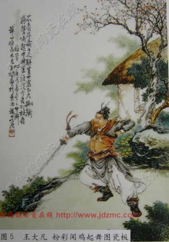 民国瓷器另一个时代特点是反映抗日战争的题材,虽然这些题材中没有英勇杀敌、血溅疆场的画面,但寓意极为明显。1937年抗日战争全面爆发,激起艺人们的抗日救国热情,虽然他们多手无缚鸡之力,但以手中的画笔为武器,以传统的仁人志士为描绘对象,如过去多不单独出现,而仅见于清代“无双谱’’中的人物此时大量出现在瓷器上,身陷逆境而不失气节的苏武,忠贞不二的关羽,闻鸡起舞的刘琨,精忠报国的岳飞,替父从军的花木兰等,都成为艺人笔下常见题材。这些题材的创作一直到抗日战争结束之后。如图5粉彩闻鸡起舞图瓷板,就是“珠山八友”之一的王大凡1940年之作。实际上富于爱国思想的作品在抗战之前就时有创作,如1931年成立的浮梁县立饰瓷初级职业学校(1932年改称县立初级职业学校,后又复原名)就曾明确提出:“国画方面,注重山水、花鸟、英雄、美人以及富有民族国家思想之描写,以期日用瓷晶之流传为复兴民族教化之助;西画图案方面,注重色彩的调和,时代的表征,装饰的合法,以期在瓷晶上充满科学及艺术兴趣的点缀,而力求中国瓷器之现代化。”可以这样讲,这是中国最早的以瓷器纹饰抒发爱民族、爱祖国情怀的宣言,也是瓷器纹饰要反映时代的倡议,对瓷器传统纹饰产生了不小的冲击,遗憾的是由于抗日战争的影响,这些新的理念没有来得及实践。 瓷器纹饰是通过艺人之手绘到瓷器上的,所以他们艺术水平的高低,直接影响到纹饰的表现力。民国瓷器虽短短38年,但纹饰上的成就是有目共睹的,而这些成就是与三代彩瓷美术家的孜孜以求分不开的。晚清时浅绛彩由于色彩单调,易于脱落,加之艺人文化水平不高而渐入穷途。而就在此时,汪晓裳、潘甸宇、周小松、许尚礼等人, 举起了复兴景德镇彩瓷的大纛,他们是第一代彩瓷美术家的中坚。汪晓裳以粉彩人物、仕女著称当时;潘匋宇山水、人物无一不精,且醉心于教育;周小松以石刻而人彩瓷业,擅神佛罗汉;许尚礼以花卉翎毛独树一帜。他们大多活跃在晚清至民国初期(1926年以前),对民国彩瓷的复兴奠定了基础,因而被称为景德镇现代彩绘的奠基人。 第二代彩瓷艺术家是以“珠山八友”为代表,并包括非八友中人,但名气及功力绝不在八友之下的艺人所组成的。他们多师承第一代艺术家,或直接师法古人。如王大凡师承汪晓裳,汪野亭、程意亭、刘雨岑均出潘甸宇门下,王琦、邓碧珊、毕渊明、田鹤仙师法古人,他们的作品达到了民国时期的最高峰,并对后世产生了深远的影响。而非“珠山八友”中人艺术成就之高,堪与八友对峙的有张志汤远学宋元之法,近追郎士宁风格,山水气势磅礴;王步则振兴了清末民初一蹶不振的青花,前无古人。方云峰、汪大沧授业于周小松,汪氏还得潘甸宇指点。他们这一代艺术家的创作活动主要集中在民国中后期,有的在新中国还继续着艺术实践。他们以新理念、新技法绘传统纹饰和新纹饰,对近代中国陶瓷彩绘的影响十分巨大。可以这样讲,没有这一代人的辛勤创作,就不会有民国瓷器现在的知名度,也不会有建国初期彩瓷的繁荣。 民国彩瓷的成熟,是第二代艺术家与稍后出现的第三代艺术家共同完成的。第三代艺术家或出名门,或得名师真传。如张沛轩师承鱼王邓碧珊,余文襄从师于何许人而成为雪景大王;程芸 农则受张志汤影响;汪小亭为汪野亭之子,承袭乃父衣钵;王锡良问技于叔父王大凡;毕伯涛之子毕渊明另辟蹊径,以虎成名。他们这一代艺术家主要活跃在民国晚期。由于各种原因,这一代中的艺术家,有的在建国后未能从事彩瓷创作,如万云岩、邹文侯、李明亮等人,或先后去世,或不知所终;有的则从事教学研究工作,如余翰青、刘仲卿等。有的则继续从事彩绘创作,如涂菊亭、刘希任等。 这三代艺术家的划分,并不是辈分的次序,主要视其创作活动的时间加以简单的区别,如第一代艺术家的创作活动多集中在20世纪20年代中期之前,第二代艺术家的创作活动则在30年代最为活跃,第三代艺术家虽艺术成就并不逊色于第二代艺术家,如邹文侯、刘希任等人,但他们的创作活动一般在30年代后期。而那些民国时期也已成名的艺术家,如1959年景德镇首批33位陶瓷美术家中的吴康、章士保、章褴等人,鉴于他们的创作高峰期是在建国之后,故不在这三代艺术家之列。 同其它艺术形式一样,瓷器彩绘也有流派,虽然这种流派并不明显,但按画风及师承划分,大致有以下几派:王琦的小写意人物画派,王大凡的缜密人物画派,汪野亭的青绿山水画派,张志汤的工笔重彩山水画派,汪大沧的大写意山水画派,邓碧珊、毕伯涛等的传统师古文人画派,邹文侯等的海派,程意亭、方云峰的写生画派及匠派。 民国时期影响最巨、风格特征最为明显的流派是以王琦为代表的扬州八怪之一黄慎的小写意人物画派,几乎是一统江湖,凡绘人物者必师黄慎之法。黄慎(1687-1768年)清画家,号瘦瓢子,福建宁化人,久寓扬州,卖画为生,擅人物,运笔纵横,气象雄伟。多取神仙故事和文人士大夫的生活为题材,有时也画纤夫、渔民、乞丐,形象往往多怪异,有时失之粗俗,为扬州八怪之一。民国初期,在王琦的身体力行下,黄慎的小写意人物画派渐成气候,就连以竹石名动艺坛的徐仲南亦以黄慎之法绘人物。特别是王琦,不仅风格直追黄慎,就连题材也深受其影响,如反映乞丐的“瞎闹一场”等作品。王步、刘希任等人的人