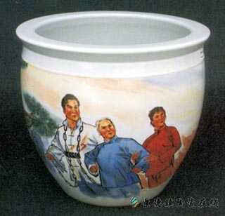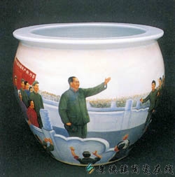缸这种器形少见。 想象不出身大体重的瓷缸在“文革”时期的用途,至少是一般平民家庭极为少见的。听说有高级官员用来养金鱼。也曾有被揭发出来的腐化干部,从家中搜出一缸一缸的红糖、白糖,这在当时确实是够腐化了。 由于缸体较阔,一般都是大场面的图案。而缸面的曲线又增加了绘制难度,所以缸上的画像总是画工精细,透视准确,气势非常宏大。从樊建川收藏的缸来看,其物在“文革”期间多半为有权有势之人家拥有。 一只大瓷缸的主题是“世界人民团结起来,打倒美帝国主义及其一切走狗”。这就使大鼻头的“美帝国主义”漫画成了那时候家喻户晓的取笑对象,有点像今天的卡通。 彩绘《毛主席接见红卫兵》大缸也是上品。构图处理得非常讲究,曲面的两侧一边是毛主席,另一边是红卫兵群像,而正对观众的画面中心则是纯洁的空白。这是那个年代要求全国人民(特别是年轻人)要具备的素质。