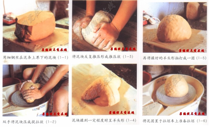 陶瓷成型技法 一、拉坯成型 泥料的成分和性能瓷泥和陶泥所含的成分不同,主要是长石的比例不同。长石含有助溶物质氧化钾、氧化钠和氧化钙等成分,瓷泥中含有以上的成分较多。瓷泥,尤其是景德镇的瓷泥,比陶泥的可塑性要弱。瓷泥烧成前后的收缩率大,而陶泥的收缩率小,物理强度也小,可吸水性强。瓷泥更细腻、更白,而陶泥的色彩更丰富。瓷泥烧成温度1300℃以上,而陶泥一般不高于1260℃。瓷质声音清脆,陶质声音混浊。 拉坯的工具一部拉坯辘轳车,泥料,钢丝托坯用的垫板(木板或陶板均可),木凳,吸水白布(揉泥用)。成型方法景德镇的陶瓷工艺分工很细,与它的发展历史 有关,拉坯的只会拉坯,修坯的只会修坯,画工、烧窑工各司其职,互不相干。作为现代陶艺家,应该具备比较全面的技能,在进行陶艺创作时,才能得心 应手,随心所欲。然而要做到这一点,谈何容易,所以在景德镇要找到一个全能的陶艺家是非常困难的。而景德镇陶瓷学院美术系讲师吴永平,不同凡响。他能拉坯,能修坯,能装饰釉下、釉上,能独立完成壶的制作,提梁的设计、选材、加工,到成型,以及壶的外包装的设计和制作,可算是比较全面的专家。尤其在艺术思维方面,有独到的见解,作品风格受西方形而上画派和构成主义的双重影响,颇具魅力。 这里我们随着吴永平一双灵巧的手,来看一看整个作品的制作过程。先从拉坯开始。 (一)拉坯成型 将瓷泥团或者陶泥团置于辘轳车上,利用辘轳的转动,用手和刮板把坯拉成所需要的形状,称为拉坯。 拉坯之前,首先要进行揉泥,通过反复揉搓泥团,使泥性正达到一种温和状态,含水均匀,泥中不含气泡,便于拉坯成型。 (1)揉泥的工具 木凳、铺在凳上一块白布、钢丝拉线、海绵、电动转盘。 (2)揉泥方法 用钢丝拉线切取相应大小的瓷泥,放在揉泥凳上(此时泥一般取材于真空练泥机练出来的瓷泥)。揉泥的方法因地区不同而异,景德镇谓之羊头形揉泥法,有的地区谓之菊花形揉泥法。步骤如下: 先用细钢丝在泥条上界下的一段泥块,后用双手用力向外推压,然后用力向内提拉,形成提拉状;随后再反复推压翻转,形成推压状;经过反复推压提拉翻转,揉的次数愈多,用力愈大愈好,把泥巴中的空气全部挤压出来。泥揉到一定程度时呈羊头形。再将揉好的羊头形拍打成一团,将泥团置干拉坯车上,准备拉坯。(图1一l一6)