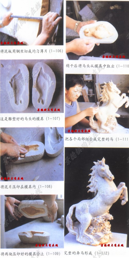(2)印坯成型 雕塑好的造型,用石膏制成模具,用泥片压印成型的方法叫印坯。先将泥料拍打成长条方块状,然后用钢丝切界成均匀的薄片;然后,平放雕塑好的马头的模具;将泥片压印在模具内;把两块压印好的。