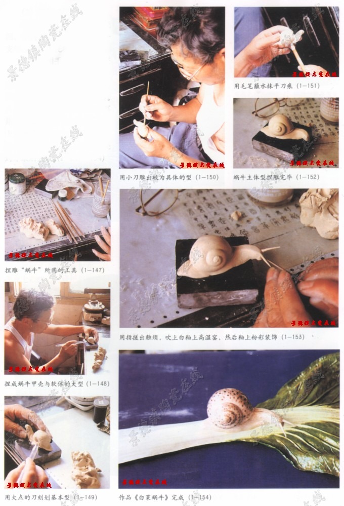 (2)捏雕“蜗牛”技法 捏雕“蜗牛”的工具:瓷泥、小竹刀数把、一杯水和一支笔、一块小托坂。 先将泥用手捏成蜗牛甲壳与软体的大型。用大点的刀刻划基本型。用小刀雕出较为具体的型。用毛笔蘸水抹平刀痕。 蜗牛主体型捏雕完毕。再用指搓出触须,然后装上,吹上白釉在高温窑中烧成白瓷。然后釉上粉彩装饰,经电炉烧烤才最后完成。(1-147~154)