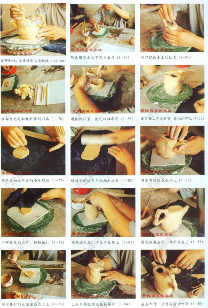 五、泥条与泥板混合成型 陶艺茶壶制作方法:泥条盘筑与泥板粘结成型是陶艺制作的两大重要方法,它们既可以以单独的形式出现,也可以两者结合起来制作,这种方法就称为泥条与泥板混合成型法。 张景辉所制作的陶艺茶壶就是采用这种混合成型法。 茶壶是中国茶文化的代表,它在中华民族传统文化的舞台上,扮演着重要的角色。景德镇的茶壶有它独特的文化价值、艺术价值和商品价值。这里介绍张景辉的茶壶制作方法。 先准备好瓷泥和数把雕刻刀具。瓷泥必须是经过真空炼泥机炼过的泥,或手工揉泥排出泥内的空气,并使泥达到最佳可塑状态。然后用木板或手将泥拍打成所需要的厚度的泥板,使之成为你所需要的壶底基本形状,然后用刀切除多余部分,使之更加符合制壶的要求。再用布托住的泥片,翻过来放在一块吸水的石膏板上,泥片放平,如马上往上做,还得再次用木板轻轻拍打,使泥的密度加强。 用手搓出一根细长的泥条,再用预先准备好的泥浆涂在乎整的泥片上,然后用泥条自下而上盘筑。在预计四分之一壶体部分盘筑完,用桠把(雕塑工具)压紧,使泥条之间粘接牢固。用木板拍打一块较大的泥板,形状和大小可根据壶的大小造型而定。把做好的泥板粘接在四分之一泥条盘筑的形上,上面用相应的一块泥板粘接好,再用桠把将其上下左右压平整如图。 用刀挖出壶盖的位置。壶型基本型确立,首先应考虑在那个部位做上壶嘴和壶把,以使壶的造型完美而有新意,又具备实用功能。在设定的壶嘴部位钻上几个小孔,既可出水,又可防止茶叶随水流出。用泥板卷成你所需要的壶嘴形,再在粘接处涂上泥浆,把壶嘴粘固在壶体上。壶把的制作可以使用实心泥捏,也可以使用空心泥捏。如果是制做一般较小的壶,可以采用实心泥捏,这样容易掌握。壶把可以随心所欲,视整体造型而变化。壶盖制作,注意与壶口吻合。可以利用工具如圆规、尺等帮助测定。盖蒂制作可用实心泥,注意造型与壶把整体统一。整体美是造型艺术的审美标准。(1-76-91)。