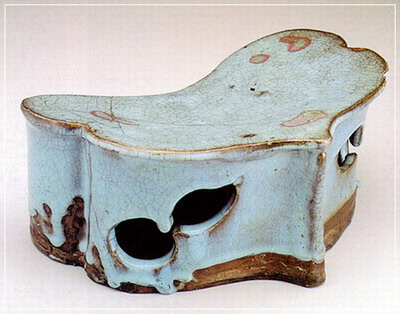 此外,还有两种特殊用途的瓷枕,一是用于托腕切脉的瓷枕,实际成了一种医疗器具,形体短小,枕面呈隋圆形,下为伏兽,高矮适中,通体饰青釉,枕面上绘灵芝草,线刻悬钩子,鸡冠花集中草药图案,雅致精美,二是尸枕,一般是将日常用枕,但也有专为死者用的,宋代有磁州窑烧制的尸枕,明代屠隆《考余事》云:引日窑枕长二尺五寸,宽六寸者可用;长一尺,谓之尸枕,乃古墓中物。”“所绘花纹,为道士符咒”所谓“为死者驱鬼所用。”