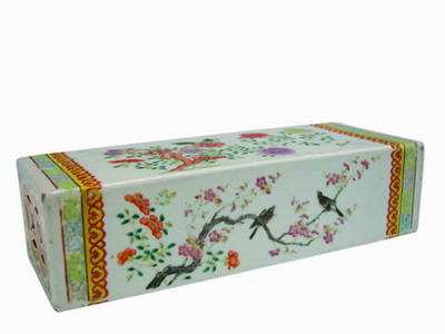当今瓷都景德镇烧造的瓷枕,多为传统式样,也有创新之作,并能从釉下到釉上满足装饰需求,任何彩类、色釉、刻划、及其花纹、图案、花面等,均可配套完善。尤其是始创于隋代的雕塑装饰,始创于宋代的颜色釉装饰,始创于元代的青花釉里红装饰,始创于清康熙的粉彩装饰和当今的综合装饰,都能用于美化瓷枕,来图加工,往往超过原稿,无一不能制作。