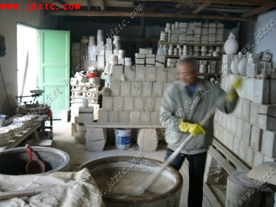 有时为了提高注浆的质量,也可将压滤后的泥饼破碎成小块,再搅拌池中加水和电解质调成泥浆。这个方案得到的泥浆稳定性较高,因为压滤时可将一些有害的硫酸盐除去。但此方法所需设备增多,生产周期长,实际上工厂往往从可塑坯料中取一部分加水搅拌成注浆料。 为节省原料有的工厂还把成型过后余下的干坯细料直接加水搅拌成注浆料。
