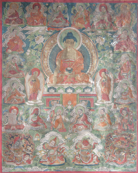这幅唐卡作者已不为人知,但整幅作品精摹细绘,设色富丽而凝重。在不大的画面中,共设置了25个主要人物,每个人物的衣着、动作、神态又各自不同,分别呈现出喜、怒、哀、乐等多种表情,给人以庄严而亲切的感觉。
