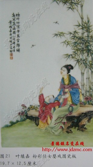 图17为王大凡1922年粉彩桃源问津图瓶,取材于晋陶潜《桃花源记》,画面采用同时期少见的通景式构图,一面为桃源山水,一面为人物。桃红竹绿处陶潜主仆二人问路居中,村民拱手施礼于右,左边村妇携童抱子于柴门,水绿色渲染地衣,以墨色点苔。人物面目表情自然逼真,设色浅淡而有深浅变化,衣纹流畅自如。另一面上方墨书“桃源问津,时壬戍年秋九月中擀,黟山樵子大凡王 写于珠山”及红彩朱文“大凡”方章一枚。底有金地红彩“希平草庐”篆书方章一枚。此作为王大凡早期作品,个人风格不甚突出,尤其是村妇姿态婀娜,线条婉转流畅,可见有汪晓棠画风。 王大凡在粉彩人物画上的创新之举为“落地彩”。王氏1939年后的粉彩人物均不用传统的玻璃白打底,而是直接将色料平涂于画面上复罩以雪白、水绿烧成,因没有洗染而称之为“落地彩”。由于案头缺少40年代王氏作品,这里只好以1953年王氏作品略加论述。 图18粉彩渔父辞瓶,画面绘屈原和渔父,人物的面部及衣衫虽不见有玻璃白打底后的洗染,但有层次深浅变化,色泽浅淡而自然,与传统的人物平涂之法亦不相,突出了笔墨技巧的应用。 王步虽以青花名动景镇,其粉彩人物亦卓而不群,特别是抗战时期所作怪佛,较前朝传统佛像题材作品开相奇古,给人以神秘之感。 图19为王步1937-1945年间粉彩无量寿佛图玉米瓶,佛像身披金红袈裟,足蹬麻鞋,持杖而立。面相奇古,眉目传神,僧衣少线多染,层次丰富而自然,山石以赭彩渲染而成,不加勾皴。石上一焦墨勾染的怪僧,造型威猛。背景以淡赭墨渲染,如烟雾升腾,又似泼墨变化。另一面以篆籀题写“无量寿佛宜子孙,竹溪”及红彩白文“王步”方章一枚,底红彩朱文“竹溪”圆章一枚,此作为王步民国时期不可多得的传统题材珍品。 民国时期从事瓷器人物画创作的名家还有方云峰、万云岩、叶缜嘉、王锡良诸人。其作品在当时亦有较大影响。 万云岩人物作品虽传世不多,但清丽的画风、沉稳脱俗的色彩亦可与上述名家一较短长。 图20为万云岩1942年粉彩仕女图瓶,人物造型纤秀修长,线条极为流畅,与民国流行的顿挫提按之法不同。面部不加渲染而罩以淡彩。与当时流行的面部施色法明显不同,颇有古风,但较前朝清秀脱俗,凸显作者的个人风格。另面墨书“乐我琴瑟。壬午清明日南州万云岩写于珠山”及红彩朱文“之印”方章一枚。底落红彩朱文“石山”方款。 叶缜嘉的粉彩人物画以构图充实、画工精细著称,为景德镇人物画缜密一派的代表。 图21为叶缜嘉1945年粉彩仕女婴戏图瓷板,人物以工笔描绘,面目勾画细腻,并略施淡彩有明暗变化。最为突出的是衣褶之处少见传统的勾线,以彩料点染而成,浓淡深浅之间颇有传统水墨画“没骨法”的韵味。 成名略晚的王锡良,其人物画亦别有特色,人物衣纹线条细挺爽利。面目亦见有渲染,但较民国早期名家之作更为传神。表现了民国人物画创作由摹古人笔意到神形兼备的变化。 图22为王锡良1945年粉彩画龙点睛图瓷板,唐张彦远《历代名画记·张僧繇》:“武帝崇饰佛寺,多命僧繇画之……金陵安乐寺四白龙不点眼睛,每云:‘点睛即飞去’。人以为妄诞,固请点之。须臾,雷电破壁,两龙乘云腾去上天,二龙未点眼者见在。”此幅画面即取材于点睛之龙腾飞的瞬间,僧繇手持画笔,怡然自得,仰望飞走的云龙,褐袍老者双手捂耳,在雷霆之中显出惊恐万状的表情,持砚童子面目透露出惊恐之色。人物不多,但表情各异,惟妙惟肖。左上题:“画龙点睛。时在乙酉春月中浣,桃源王锡良写并记于珠山客邸”及红彩朱文“之印”方章一枚。 民国时期不署名的粉彩人物图器物较为常见,多为高档陈设瓷,从画面上看以传统题材为主,有八蛮进宝、耕织图、庭院仕女、四妃十六子、唐明皇游月宫、吹箫引凤、八仙过海、罗汉、明皇试马、仙女散花、西洋人物等。依绘画材料可分为粉彩、青花、五彩、青花釉里红、粉彩描金等。大多数作品底落前朝款识如“大明宣德年制”、“大清乾隆年制”、“乾隆年制”等,而粉彩器物则在外壁落“世宁”、“乾隆御览之宝”等印章。画工精细,施彩讲究笔法。面部多有渲染,时代特征明显。虽作少有作者名号,但从画工来看,亦为当时名家之作。 图23为红彩描金八蛮进宝图瓶,八蛮古谓南方的八蛮国,《礼记·王制》“南方曰蛮”,孔颖达疏引,《尔雅》汉李巡注云:“一日天竺,二日咳首,三日僬侥,四日跛踵,五曰穿胸,六曰儋耳,七曰狗轵,八曰旁春。”后泛指外族,为清代瓷器传统人物题材之一,寓意中华强盛,外藩来供。民国时国势日微,瓷器上绘此图当有期望国家振兴之意。此作构图饱满,虽人物众多,但不繁缛。所绘人物形态各异,神态逼真。所供之物不同,或持如意、灵芝,或举宝塔、鹿角,或托方钱、瑞兽。线条流畅,红彩鲜艳,金彩辉煌。底红彩白文“乾隆年制”篆款。 图24粉彩仕女图瓶,外口沿饰一周如意云头纹,颈部为一周璎珞纹,近底处为一周莲瓣花卉纹,均以料彩绘画。此为民国时典型的瓶类器物装饰方法之一。外壁一面以粉彩绘仕女图,高大的屏风前,三个仕女围书案而坐,身后圆几上有洞石、书箧,前边博古架上置盆花,一侍女携琴而来。构图饱满,人物造型准确俊美,衣纹洒脱流畅,虽设色多见红绿二彩,但有淡雅之风韵。人物面目见有渲染,与传统仕女绘画明显不同。另一面墨书“争先春色在眉端,