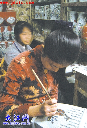为了将老瓷器的瓷画仿得更到位,工人们往往用细笔蘸墨描摹。图为樊家井的一名女孩在摹民国瓷画。 |