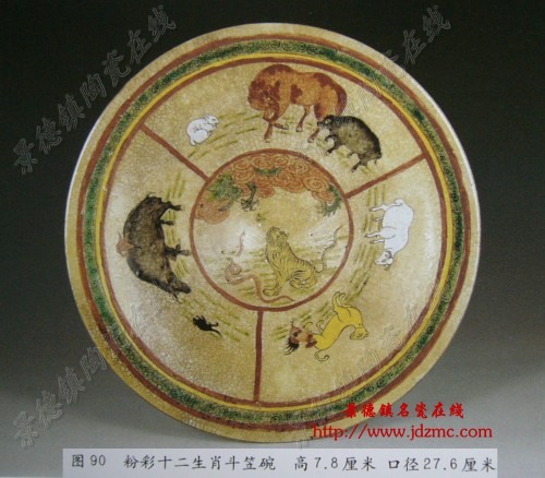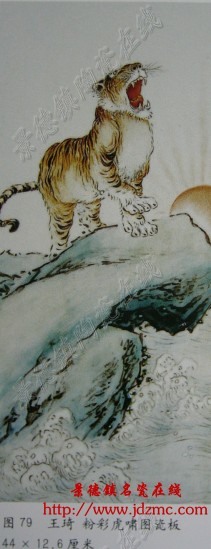 值得一提的是民国时期的一些非擅画动物的名家亦偶作动物画,如擅长人物画的王琦、王大凡曾绘虎,如以花鸟名世的刘雨岑、余翰青有鱼藻、鹿传世。虽然所作非其专长,不能同以此为业的名家相提并论,但因艺术修养深厚,如京剧名家客串一样,其功力亦非寻常艺人可比。 图79为王琦粉彩虎啸图瓷板,画面上部为大面积空白,下为腾起的海涛,中间巨石之上一只猛虎仰天长啸,旁为一轮光芒四射的红日,猛虎形态逼真,可见作者造型能力之强。上题有“拟唐寅之笔法,西昌匋迷散人写意”及红彩方章两枚。 图80为王大凡1936年粉彩虎啸图瓷板,画面构图为斜三角形,左为大面积留白,一只下山猛虎,造型准确,形神兼备,气势凶猛,皮毛见有皴擦之笔,毛感自然。平心而论,此作虽不及毕渊明成名之后的虎,但较上图略胜一筹,左边墨书“时在丙子年立春节后一日,黟山樵子大凡王壁画”及红彩朱文“ ”、“大凡”方章二枚。 民国时的狮纹多装饰在档次稍低的日用器皿上。 图81为民国时期最为常见的红绿彩狮子纹帽筒局部,一头红狮体态健壮,头下尾上,眼大如铃,尾毛旋转如轮,极为活泼可爱。上有一绿彩小狮,下为蓝彩戏球小狮。造型夸张,虽画工不精,但民间狮子舞的韵味浓郁,另侧有墨书“时属丙辰仲夏”字样,为1916年作品。晚清时多见此纹饰器物,如图82为清光绪矾红彩太狮少狮图瓷板局部,大狮子怀抱绣球神态认真,小狮子昂首高望。狮子毛发细密,浓淡过渡自然。绘画较前者细腻,但活泼可爱的韵味不足。由此可知,民国时的写意之作多追求民间浓郁的生活气息。 图83为民国珊瑚红釉太狮少狮图瓶,此纹饰为清代传统纹饰之一,以狮谐师。太师古代官名,为三公之位最尊者,周代始置,辅弼天子治理天下。少师古代官名,为三孤之一,周代始置,亦为辅弼天子之官,地位次于太师。此器纹饰有康熙官窑之风,线条流畅,绘画精细,体格健壮,填彩之后用墨点饰。鬣毛如卷云,尾毛似绣球,惟凶猛威武的神态不及康熙。但较晚清同类题材的民间色彩及装饰味仍有很大区别。底青花双圈“大清康熙年制”楷款。 鹿纹在民国时较为常见,擅长此技者有方云峰、余翰青及莫秋霞等人。 图84为方云峰1931年粉彩鹿寿松贞图瓷板,画面左疏右密,右边虬劲的古松枝干盘曲,使画面极富韵律。松针以线勾描,笔法工整,但不呆板,上罩青绿,于色彩深浅变化中表现出茂盛之意。居中的梅花鹿造型准确,与图75一样,于传统笔墨中加入西洋素描技法,皮毛质感强烈真实,为前人所不及。左上方墨书“鹿寿松贞。辛未仲春方佩霞写于珠山”及红彩白文“方”圆章一枚。 图85为余翰青1941年粉彩双鹿图印泥盒,在直径6.5厘米的印盒面上,作者绘有一卧一立双鹿,虽笔法不及方云峰之作细腻真实,有传统鹿纹的影子,但皮毛及梅花斑点亦非晚清笨拙体态白彩点饰之作可比。左边墨书“辛巳春月抚元人法于珠山”丛红彩印章两方。印盒底外壁墨书“伯作宝篇,子厂孙孙永”篆籀文及行书“翰青书”,另有红彩白文“画印”一枚,底红彩方框“翰青”楷款。 蝠纹为清代传统吉祥寓意纹饰之一,或福山寿海,五蝠捧寿,或云蝠,洪福齐大。民国瓷器上的蝠纹多仿清代风格,构图无变化,但画法略有新意。 图86红彩蝠纹碗,构图疏朗,蝠纹姿态舒展大方。翼展较宽,筋脉清晰可见,正面色彩渲染有深浅变化,背面填色上加点饰,绘画细腻。底虽书“大清乾隆年制”篆款,但非仿乾隆之作,因乾隆蝠纹多少有些图案化倾向,而与晚清装饰韵味浓郁的蝠纹更截然不同,艺术成就较高。 图87青花福山寿海图瓶,纹饰构图为清康熙时多见,苍茫云天,海浪起伏,一仙山由海浪中突兀而起,十只青花蝙蝠在穿梭飞舞。仙山皴法细腻,海水线条流畅。蝠纹高度写实,头如鼠,须如芒,翼上有浓淡变化,姿态生动传神,青花色泽淡雅而富有层次,与晚清蝠纹双翼细长,或弯如弓的平涂画法明显不同。 以狼和猪为瓷器纹饰历代少见,狼因其性残而为艺人所不为,《广雅·释诂》:“狼,戾,很也。”猪则因体肥态憨不见于瓷器装饰,而二者组合在一起的狼奔猪遁图则更为新奇。 图88为粉彩豕狼图瓶,口沿处饰——周蓝料回纹,下为璎珞纹饰,足外墙亦饰一周回纹。画面构图饱满,一只恶狼在原野上追逐一只肥猪,体态一瘦一肥,色泽一黑一褐,下为皴擦而成的洞石,上为勾线渲染的松树,背景开阔。狼猪有西洋笔法,衬景则为中国传统画韵。背面墨书“豕性钝为首,狼形恶为贪”及“乾隆御览之宝”、“仁化”、“世宁”、“碧露”红彩印章四枚。底“乾隆御制”楷款。 海兽为明代艺人杜撰之兽,明清两代瓷器上多见此兽。民国海兽纹饰多承袭清康熙民窑风格。图89为青花海兽纹凤尾尊,外壁分上下两组海兽纹饰,中以细密的几何条纹相隔,海兽凶猛威武,肌肉隆起处有细密均匀的鳞甲。与康熙民窑作品相比较,绘画不甚工细,特别是尾毛以细密的线条代替渲染。头部生动气韵不足,略显呆滞。青花色泽泛紫,层次感稍差。即便如此,仍不失为较成功的仿前朝之作。 民国时见有绘十二生肖纹饰器物。十二生肖又称十二相属,是古代以十二种动物配十二支,后以人生在某年即肖某物,如子年生的肖鼠,丑年生的肖牛等。其起源于何时不甚可考,清赵翼《陔余丛考·十二相属起于后汉》:“窃意此本起于北俗,至汉时呼韩邪钦塞人居五原,与齐民相杂,遂流传人中国耳……则十二相属起于后汉无疑