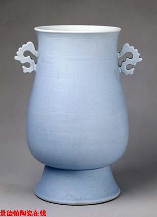 瓷器耳的式样之一。即器物的耳作成螭虎形。于明、清景德镇窑瓷器上较为多见。典型器如明嘉靖蓝釉螭耳瓶,万历黄釉紫彩螭耳瓶、青花螭耳瓶,清康熙天蓝釉螭耳尊等。 清天蓝釉兽面纹螭耳尊 |