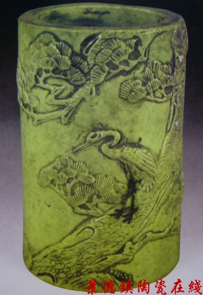 ![]() ![]() 王炳荣 绿釉堆花松鹤延年笔筒 清光绪 |
