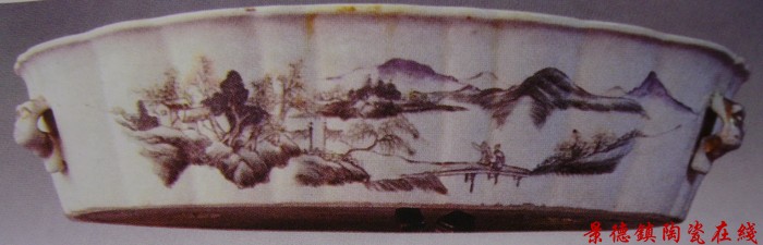 ![]() ![]() 闵丹臣 粉彩山水纹瓜棱盆 民国十九年 1930年 |