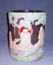 此外,他在创作中十分注重对于作品的文学性物点的表现,通过对人物形象的面部表情、手势动作乃至某些情节性的构思和安排,使瓷雕作品中的人物形象不但符合人物自身的性格特点,同时还通过对某些细节上的夸张与变形,使之具有一定的情趣和幽默感。例如人在《三顾茅芦》瓷雕作品中对刘备、关羽和张飞各自不同性格的形象刻画,不但具有鲜明的个性特点,同时也丰富了文学原著的内涵,又如《三个歌唱家》中不同神情的塑造,那充满少许情与乐观的气氛,经作者略加夸张顿时显得妙趣横生,确是一件颇具现代生活气息和幽默感的上乘之作。由于他在创作中注重“尚自然、少雕琢、巧寓意、忌直露”的艺术表现手法,加之他又善于用高温色釉来加以装饰,使作品显得纯朴自然。多年来,他的作品颇受人们喜爱,有不少作品在全国、省、市各类展览评比中获奖。如《华佗》、《张衡》获一九七八年全国科普词不达意术创作二等奖,《达摩周游》获一九九0年全国陶瓷艺术展评三等奖,《双鹿钟座台灯》获一九八六年全工艺台灯评比第三名,全国工艺品百花奖优秀作品奖。另有十余件作品分别被国内外有关展览馆收藏。此外他所设计制作的大型漆版镶嵌浮雕《孔誉牡丹》被选入人民大会堂江西厅陈设。他还曾两次应邀赴香港、新加坡作瓷雕现场技艺表演,产生了强烈反响。