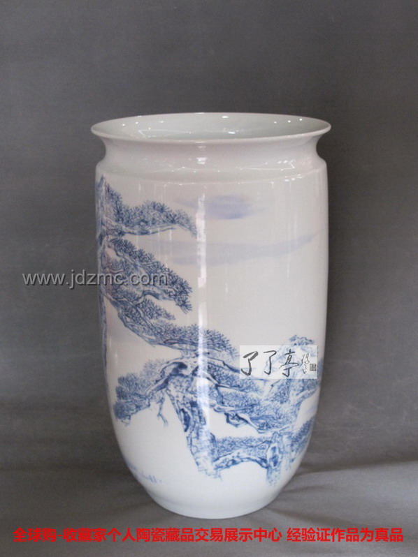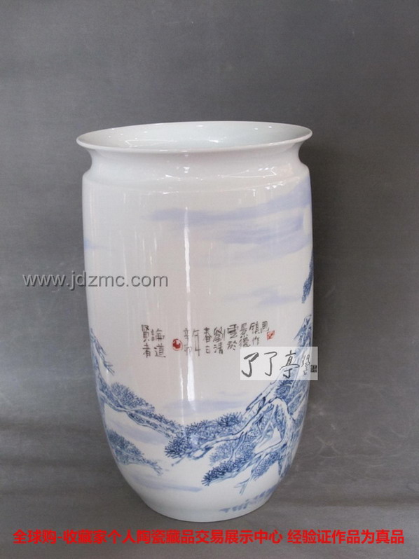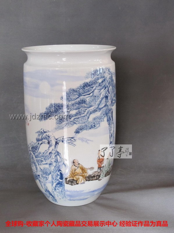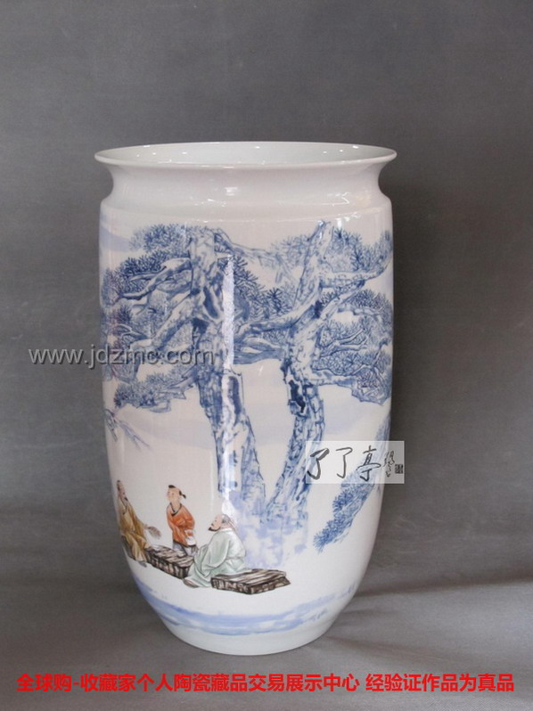 创作艺术家:刘青云 江西省工艺美术大师 作品的名称: 《贤者论道》瓷瓶 作品的大小:高:44.5cm 宽度:26cm 高温釉下彩 配备的鉴定资料:作品证书 是否有残次瑕疵:无瑕疵 作品所在地:景德镇