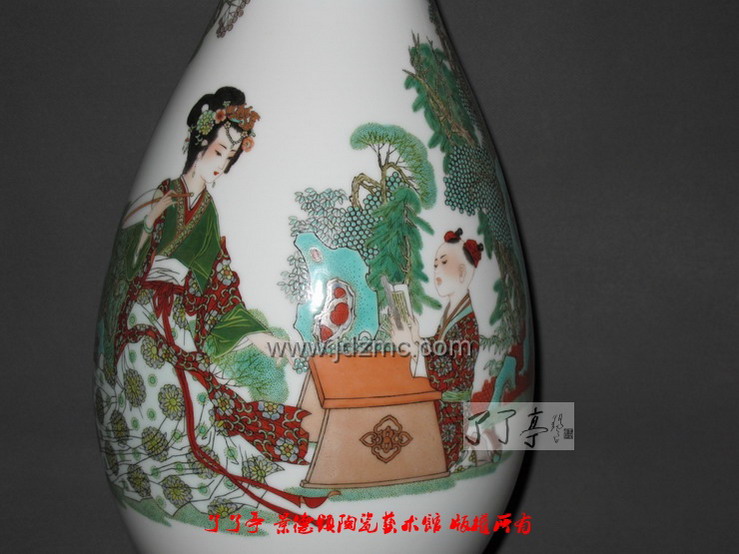 在景德镇这赣北的繁华小城里,每一家对子女的教育都是非常在意的,在景德镇到处都是琴院,棋院,书院,画院,和跆拳道馆,遍洒着孩子们上学堂的风景。普天下牵挂的心是一样的,有一件作品映入视线,值得您全神端视的当代古彩作品-“课子图”,作者是方复教授。此作品,以母亲教导孩子读书为主题,母亲面容端庄神情专注,孩子在母亲指导下朗读诗文。一座仿古书台至于画面中间,花草竹阴,石树丛丛,充分展现书香世家之母子亲情。