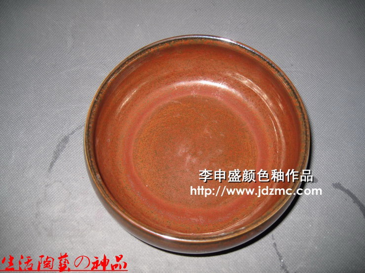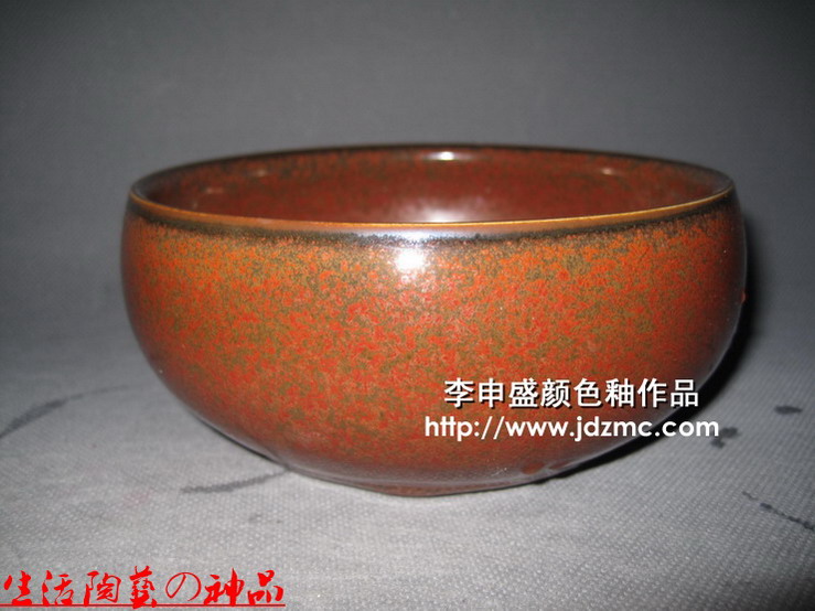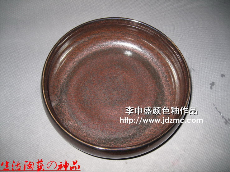 颜色釉的独特魅力在于你任何工序上的疏漏,考虑方式都会对成瓷产生决定性的影响,而这种影响随着成瓷后将不可逆,即使你通过成瓷上的蛛丝马迹来寻找解决方法,也是云里雾里的,也需要通过一次次痛苦的实验来判断出来。比如,这两个钵都是铁锈斑的釉,泥巴一样,吹釉的方式一样,吹釉的厚度大概相差一层而已,右边的一个钵是第一窑烧制的,放置中上窑位,烧制的效果是红色,铁锈斑明显。而左边的钵黑金效果,只是因为满窑的时候一处釉面受创,不得不重新补釉,这样左边的钵是第二炉窑烧制,位置中前。可是您看看,两个钵烧制效果完全不一样。连我都说不清楚原因。