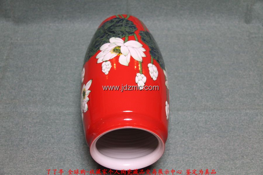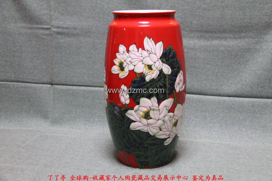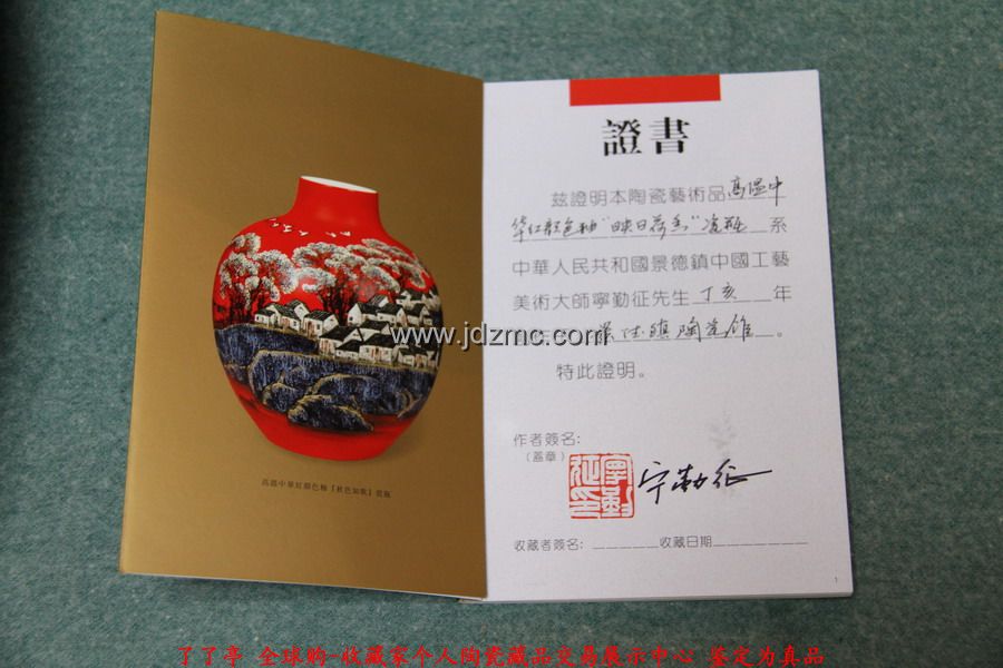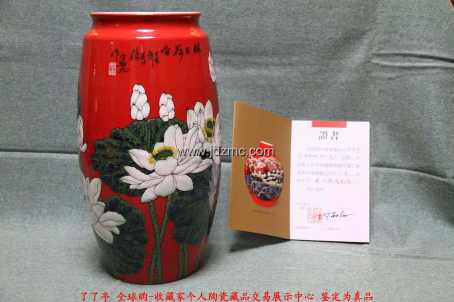 创作艺术家:宁勤征 中国工艺美术大师 作品的名称: 高温中华红颜色釉《映日荷花》瓷瓶 作品的大小:高38公分\腹径20公分\口径15公分 配备的鉴定资料:作品证书 作者和作品合影 是否有残次瑕疵:无瑕疵 作品所在地:即将送至景德镇 了了亭