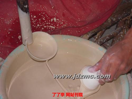 圆器制作,若是器内没有装饰的,则需要先上里釉。器物外面的釉则是后期第二次的浸釉。釉,是附着在陶瓷坯体表面的玻璃质薄层,与玻璃有着类似的物理和化学性质。釉一般以石英、长石、粘土等为原料。陶瓷施釉的方法有:喷、吹、浸、浇、荡等方法。里釉(器物内部的釉面)和底釉(器物底足的釉面)我们采用的是传统的荡釉法,外釉我们采用浸釉法。