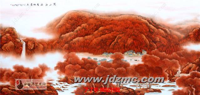 刘伟大师的这幅作品在红白黑的对比中书写南国的深秋景色,带有明显理想化的诗意色彩,包含着作者对祖国山河无限的深情,重新构建了一种不同于国画的艺术形象和意境,在陶瓷艺术上可谓“红色积彩山水”的典范之作。作品分近景、中景两个部分:近景描绘了飞瀑流溪和层层错落的红色树木,冷暖交映,层次幻化;中景重点刻画了气势磅礴的山峦丛林和树木掩映的山村小屋;部分远景辅以墨色加重,层层推进。为了突出强调诗词中的“红遍”、“尽染”的意境,作品以俯视的角度,开阔的视野,构图博大雄浑,极具张力;色彩特别饱满,浓艳强烈,既深沉静穆又层次丰富,林间的白墙灰瓦,山上的流泉飞瀑和山下的流溪水塘,互为衬托,极具气势,林间隐隐约约的暮归人家,更使整幅作品渲染出远离喧嚣的山村美景。