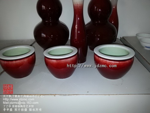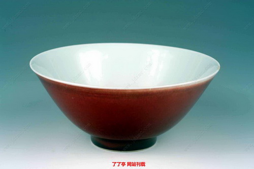 7 郎红的底足与器内,或呈米黄色或呈浅绿色,俗称米汤釉与苹果青釉,也有少数底为本色的红釉底;而祭红的器内器外,均无此特征(指米汤釉或苹果青釉或红釉底特征)。