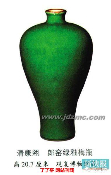 郎窑绿的作品并不多,它比郎窑红更有价值。民国时期有很多藏家在搜寻绿釉,有个别的瓷器是用康熙年间的旧胎挂上绿釉重烧的。今天由于化学工业的发达,我们能比几百年前的人多看到更多种颜色,从某种角度来讲,我们是幸福的。但是反过来说,我们又是不幸的,因为这些颜色大部分是化工颜料染出来的,我们的感官被强烈地刺激过,现在再看古代作品上精湛的工艺就有些麻木。康熙一朝的人们,包括康熙皇帝,看到这么漂亮的瓶子时,其感受和我们今天的人是不一样的。所以在文明进程当中,有所得就有所失,我们的任务就是把这些丢掉的东西尽可能捡拾起来,展现给大家。