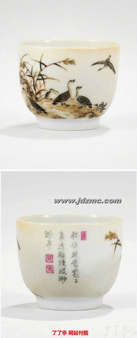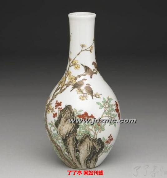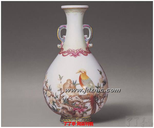 2005年10月香港苏富比拍卖的御制珐琅彩“古月轩”题诗花石锦鸡图双耳瓶,高16.5厘米,“乾隆年制”蓝料款,卷草形双耳,肩部饰卷草如意,主题 纹饰为锦鸡花石。此器为乾隆皇帝特别烧制的赏玩器,西洋画风和传统水墨相结合,惟妙惟肖,秀丽别致,“新枝含浅绿,晓萼散轻红”二句题诗,更添文人气息, 为乾隆珐琅彩精品。在香港拍卖时以1.15亿港币成交(约合人民币1.22亿元)。此件瓷瓶伦敦佳士德曾在1975年拍卖过,当时的成交价1.6万英 镑,30年的时间,价格增长了515倍。这样高的回报率,其他投资项目恐怕永远都无法做到。