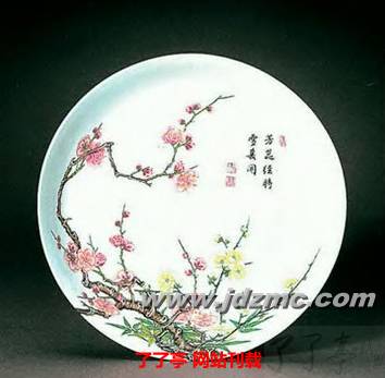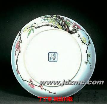 雍正皇帝在位虽只有十一年,珐琅彩瓷器存世量相对康乾时期要少得多,但不乏精品。2002年10月香港佳士德拍卖的清雍正珐琅彩题诗过墙梅竹纹盘,口径 17.2厘米,双方框“雍正年制”蓝料款,所绘梅竹是典型雍正过墙花纹样,配有题诗“芳蕊经时雪里开”。拍卖时以3252.26万港币成交(约合人民币 3447.55万元)。类似的珐琅彩盘,目前已知的仅有两件,日本东京国立博物馆一件,日内瓦的某私人藏家有一件。