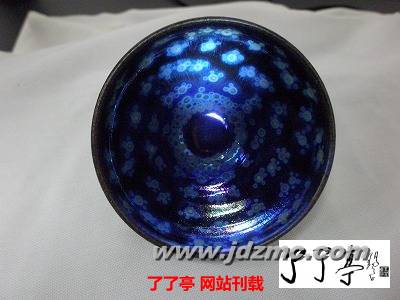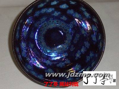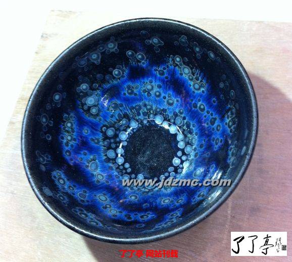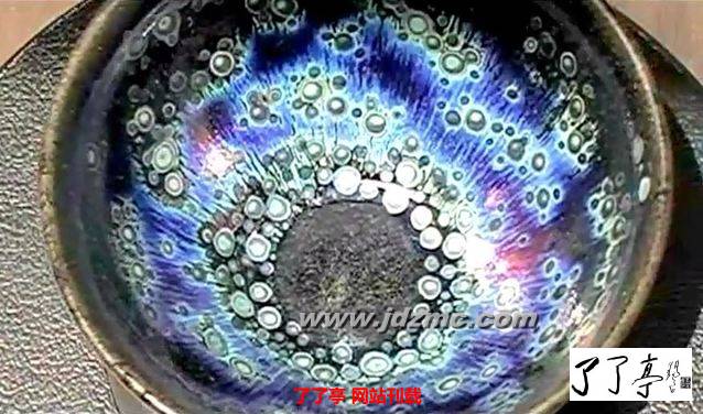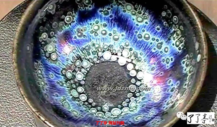 长江惣吉的曜变天目,在灯光的照射下,各个色彩斑斓、熠熠生辉,既透射出华贵、又展示着其自然与典雅,令人赏心悦目,赞叹不已。与林恭助的作品相比,其反射光线的色彩更加丰富,更加变化多段,这一点在自然光下更为明显。