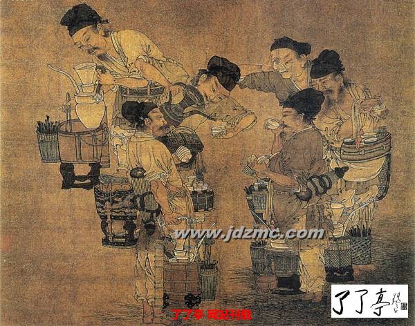 所谓点茶法,“点”就是用沸水将茶末点化成茶汤的意思。点茶的程序需要先从茶饼上取下一块,用密纸包住,从外面加以锤捣,然后再用茶碾碾碎,过筛后就开始煮水,待水沸后稍等一会,再去冲点,可以保证茶味甘甜,而接下来的点茶需要在茶盏中进行,取定量的茶末于盏中,注入少量的水将其调成膏状,再用更多的水冲点,一边注水一边用茶筅搅动,叫做“击拂”,这时茶面上出现乳白色的浮沫,浮沫的颜色和持久度成为衡量茶品好坏的标准。在宋代,朝廷在地方建立了贡茶制度,贡茶产地需要一种方法来评定茶叶的品位高下,根据点茶法的规则特点,逐渐发展形成了一项有趣的竞赛——斗茶。