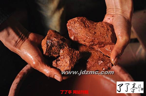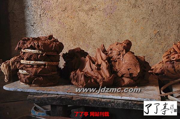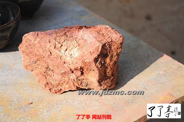 在作坊的一个角落,我们看到了烧制建盏的瓷土,颜色红中带黄,听吴师傅说,瓷土是用四种不同的土配制而成,含铁量很高。超过1300°高温烧制好的胎骨厚实坚硬,叩之有金属声,俗称“铁胎”,含砂粒较多,露胎处手感较粗糙。