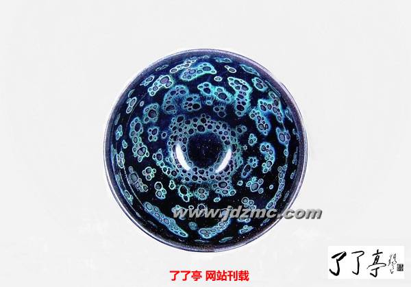曜变斑盏,此盏内外壁黑釉上散布浓淡不一、大小不等的琉璃色斑点,光照之下,会折射出晕状光斑,似真似幻。这种变化本是偶然出现,始料未及的,非窑工人力可为,因此,其成品极为罕见。说到曜变建盏,不得不提这只藏于日本东京静嘉堂文库的曜变盏,宛若天成,堪称盏中极品。建盏的斑纹是在烧制的过程中自然形成,可遇而不可求。宋代采用龙窑烧制,温度等形成斑纹的条件控制得不好,或高或低都将造就千变万化的斑纹,其中就有可能出现以上的曜变斑纹。当今建盏手艺人对此盏推崇备至,是很多手艺人终其一生的艺术追求。
