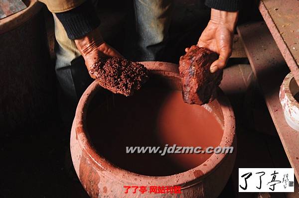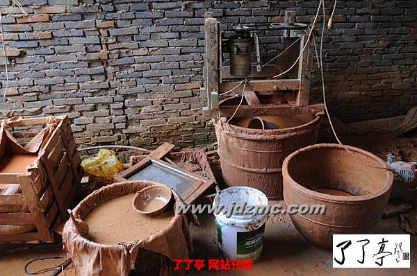 房间里摆的几个陶缸是用来制作釉水的,釉料刚采回来的时候有点像一块块普通的矿石,在水中浸泡慢慢软化成浆状,过滤掉残渣,加入草木灰等一些其他配料就成了釉水,这个过程要很长时间。但我们比较欣赏和喜欢这种原始的配釉方式,建窑之外的建盏手艺人,基本都使用化学釉,烧制出来的建盏缺少传统釉料建盏的古朴之美。