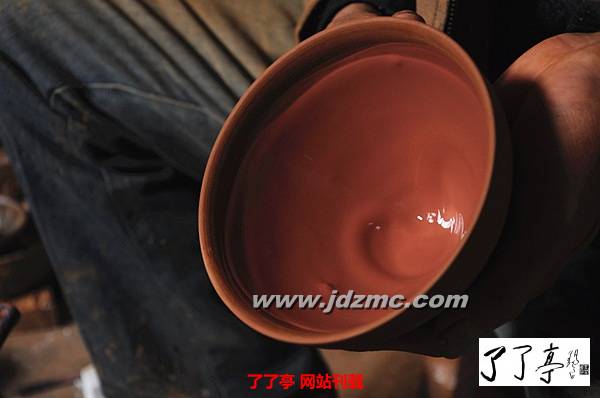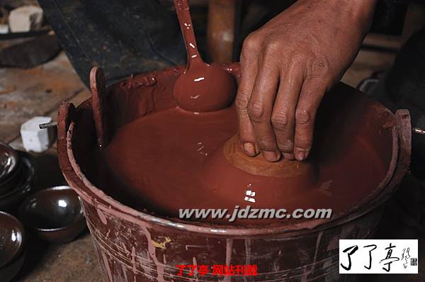 做好的釉水颜色偏红,黏性强,属于含铁量较高的石灰釉,因此具备烧成黑釉的基本条件,其最大的特点就是在高温中流动性强,低温时结晶生成各种奇特的斑纹,斑纹在不同光线下色泽和明暗也不同,变化丰富,非常美。施釉时,用手捏住圈足,胎体倒置斜着侵入釉水,在釉水中停留一段时间,让釉水渗透进胎体,直到胎体挂上足够厚的釉。吴师傅直接用阴干后的胎体施釉,而不是常用的先低温素烧后施釉再高温烧制的做法。这点做法也比较传统。