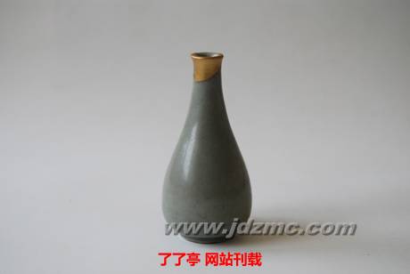 这件南宋龙泉胆瓶口沿有一块缺损,大约还留存了一小半,幸亏有这部分可以作为修复的依据,不然就很难推敲出本来的样子。金缮有时候需要把漆堆得比旁边稍微厚些,有一种“包住”的感觉,然而这件不可以这样,而是需要做到和瓷器的线条完全一致,平滑无碍。缺损部分的左边釉面上还有两条长短不一的冲线,我在思考如何处理这个位置的时候忽然想到了宋徽宗的瘦金体,所以这个我用这样一种书法的笔画来表现,也斟酌了笔势和整个金面弧线的关系。整个修复过程约40天,先用杉木做胎,然后用漆灰黏合杉木胎和胆瓶缺损处,等漆干燥后再上金。