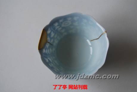 [金缮]: 日语中称为“Kintsukuroi ”,将瓷器碎片由天然大漆黏合,表面再敷以金粉或者金箔,装饰性较强。金缮本质上是漆艺的范畴。金缮修复有很广的适用范围,用作于瓷器和紫砂器居多,除此以外也可以用作于竹器,象牙,小件木器,玉器等。