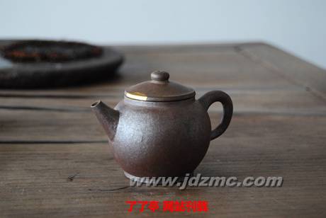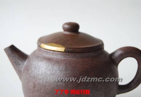 很小的一件巨轮珠紫砂壶,因为特殊的窑内环境,所以壶的表面泛着一种金属的光泽,很酷很好看.盖子有一块残缺,用木块做了一个胎,然后用生漆黏合上去,这件需要将其打磨的和盖子的形状完全一致,转折处不可以有丝毫含糊,干脆利落才好看.金上也很成功,看上去很得体.费时一个半月。