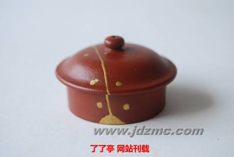 这把可爱的朱泥小壶曾经锔过,年久局部锔钉有松脱。这是一件很小很薄的紫砂壶,很考验锔瓷的手艺。物主觉得可以在第二次修缮的时候尝试一下金缮,用一种古老的修复技术再次延续这件器物的寿命。原本很担心锔瓷留下的钉孔不好处理,做出来会难看,没想到做完以后发现这两排钉眼很有排列的趣味,别具美感,活脱像红色西装上的双排扣。
