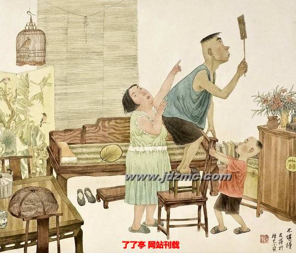 陋室小,家什多,蚊蝇也来凑热闹。手持拍子搭椅凳,一家三口瞪眼瞧。
