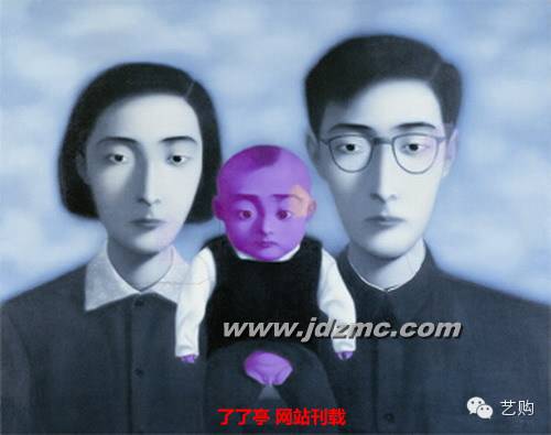 张晓刚的机器人的最显著的标志是僵尸的眼睛,像面具和僵死的表情。穿着1960年代流行的毛制服。对年龄大的人,张的肖像立即唤起我们对雷尼·马格里特(Rene Magritte 1898~1967)画作的回忆,那是对现代艺术大师马格里特的低劣模仿。