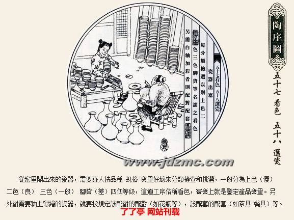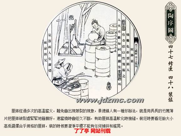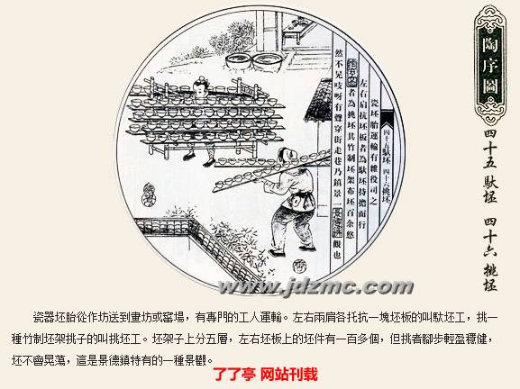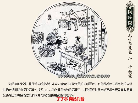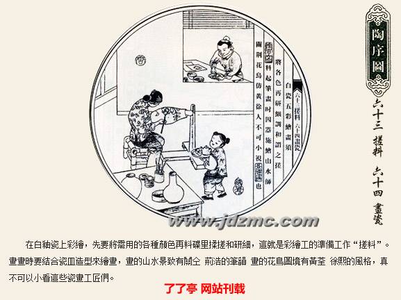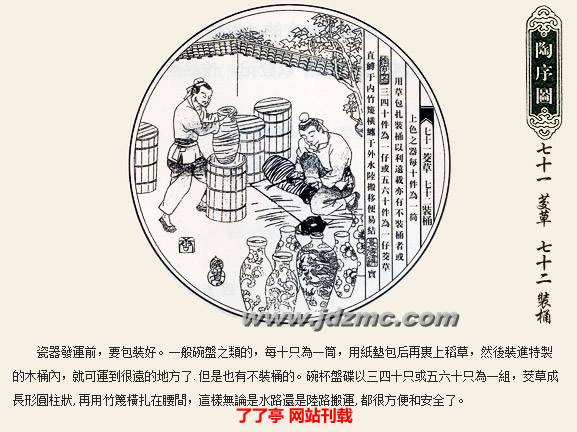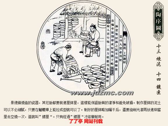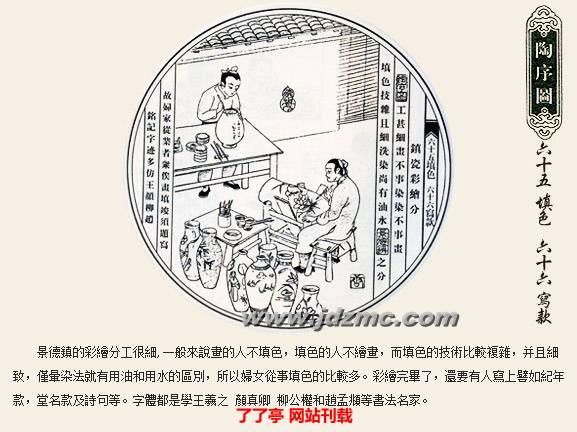 明代科学家宋应星的《天工开物》记载:“共计一坯之力,过手七十二,方克成器。”一只普通的杯子细分起来工序达到72道之多,每道工序都简化到不能再简化的程度。炼泥的只管炼泥,拉坯的只管拉坯,彩绘者也是画者画而不染,染者染而不画,如此明细分工提高了制瓷效率,也使景德镇瓷器得以成为全国瓷器的翘楚。
