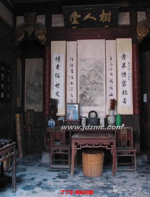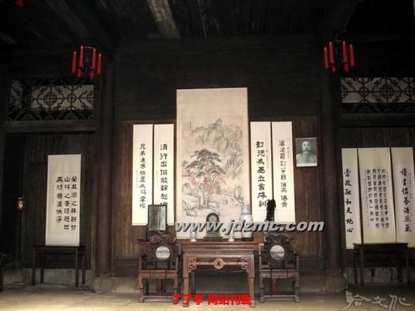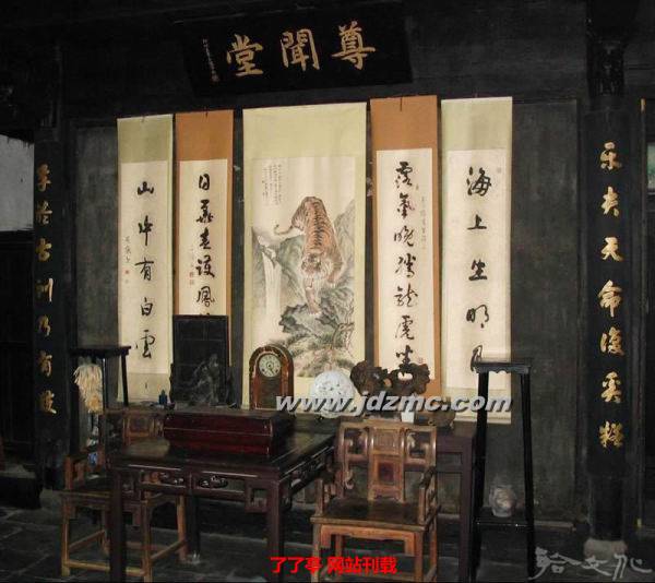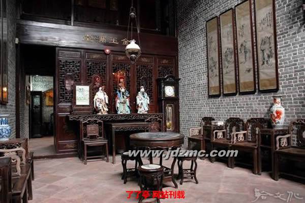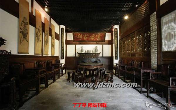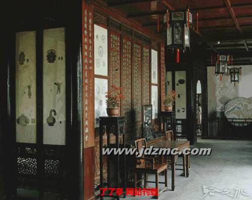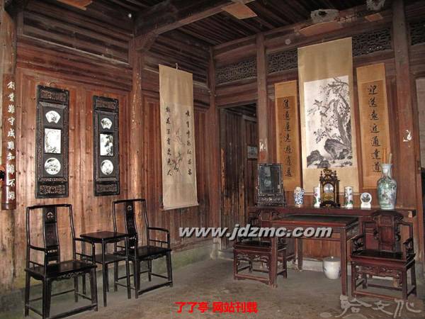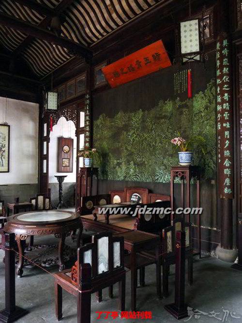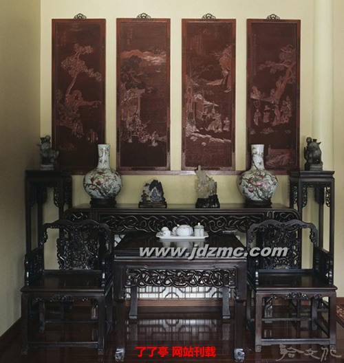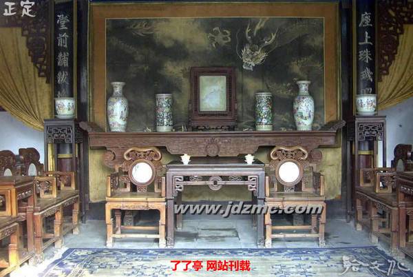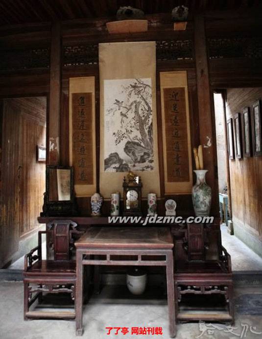 明清时期,江南经济发展很快,大兴园林建筑,厅堂修建得高大宽敞,故厅堂家具的形制也较高大厚实,陈设时讲究规范化与对称性。如在厅堂正中靠墙设一扇屏风或悬挂屏、书画,前面设长案,案上陈设座屏、牌位、瓷器、石玩等,有的在案前设茶几或八仙桌,两边有椅。厅堂的中间两侧对称放置椅子与茶几。厅堂的两边放置较高的花几,用来摆放花瓶或花盆以作装饰。一般来说,厅堂家具较规整、厚重、典雅.对称摆放是家具陈设的重要原则,这样可营造庄重的气氛。