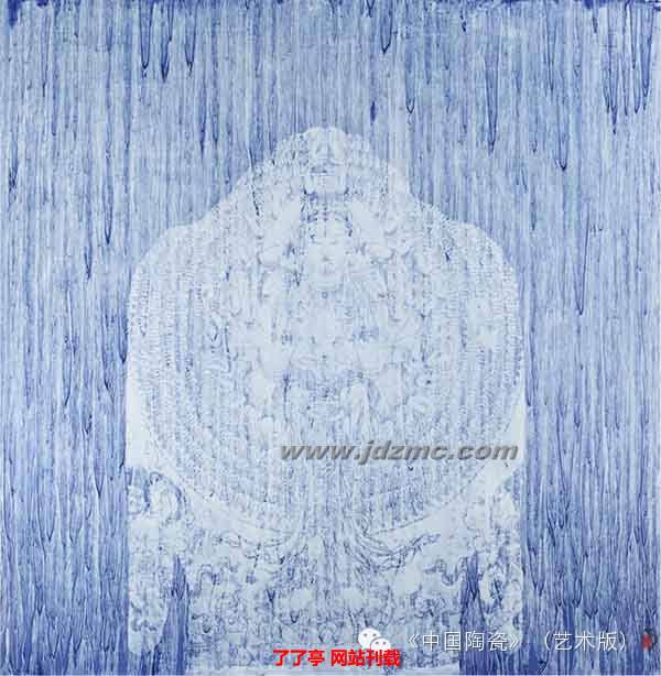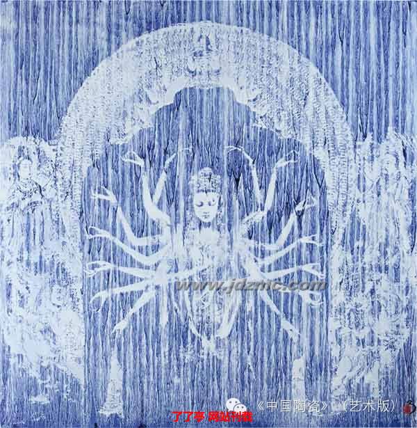 之前去过几次敦煌的缪野仍觉无法很好地把敦煌表达出来,只能通过一种印象式的把他认为所看到的最美的画面穿插进时代感的创作手法表现出来。“当时去采风,印象最深的就是千手观音,多种形式,多种组合,这是宗教文化特别是佛教文化的集中体现。我能感受到那种古朴、宏大和庄严。所以,我的创作始终贯穿的主题是观音或释迦牟尼的佛像,每幅画的中心点其实就是释迦牟尼佛像的一个影像,再就是千手观音的壁画和彩塑千手观音。我就是画自己想画的东西,创作自己想要创作的作品,真正的艺术表达一定是自己内心感悟和思索。”在看过敦煌中的千手观音壁画和现代千手观音等资料的基础上,加入作者对宗教的理解,绘成了如今这与众不同的青花。