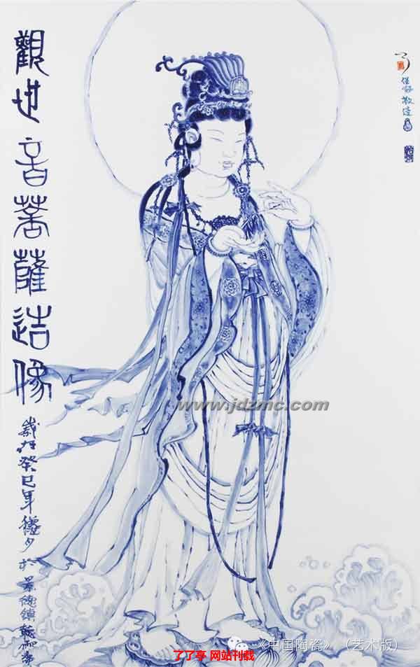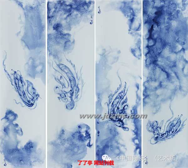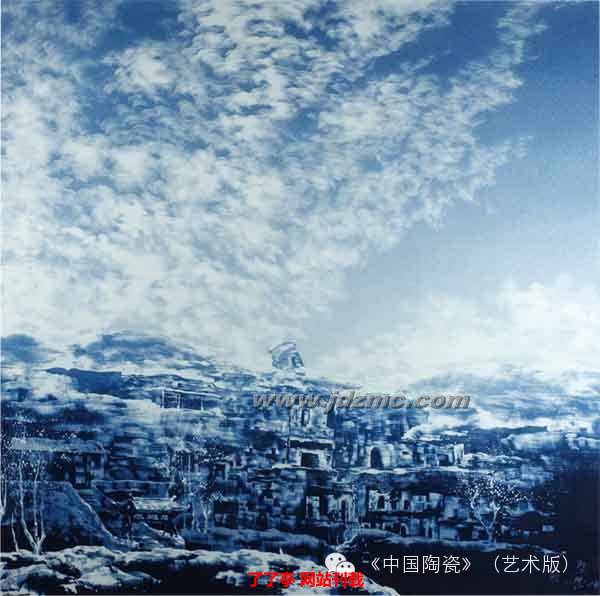 创新是艺术品最初的源动力。艺术家们无一不想跳出人群,创造出独一无二的艺术绝品,为此,朱斐翡在创作《东方神韵》时没有加入任何敦煌壁画的背景及有关图案,而是全部以单色的形式表现飞天在蓝天翱翔的自由景象,“我的创作灵感就是来源于景德镇的天空,它非常蓝,非常空灵,我想这时候要是在天空中出现了一个飞天,那该有多美,我就把景德镇的天空跟‘视觉中国·瓷上敦煌’中国陶瓷艺术展结合起来了,而青花又被称作‘中国蓝’,用这种可以代表一国之色的陶瓷元素作为表现形式来创作敦煌飞天是再适合不过了。”