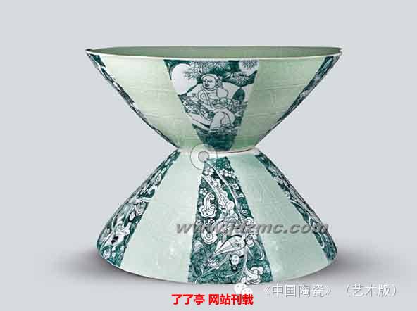可拆可分的两个斗笠碗,画与刻结合立体感很强,拆开后个自独立,叠在一起像个腰鼓,天青釉的浓淡略有变化,一个偏绿一个偏青,这种同色调不同色度的设计也让作品不死板,掌握到位柔和过渡,凝重但不是厚重,这种设计感也是现代才有的,腰鼓的形象也代表她对此次“视觉中国·瓷上敦煌”艺术盛宴的喝彩。